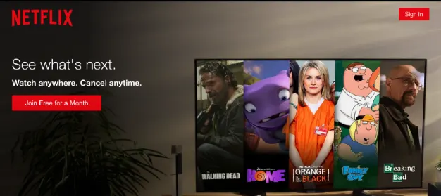 L'invito all'azione di Netflix è breve e chiaro. Si distingue e spiega in modo conciso ai consumatori cosa possono aspettarsi quando cliccano.